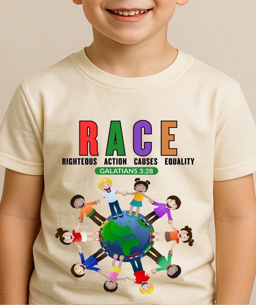 The message behind our RACE tee shirt is simple, powerful, and needed now more than ever. RACE stands for “Righteous Actions Causes Equality,” and it’s more than just an acronym—it’s a movement to teach our children the true meaning of unity, kindness, and justice.